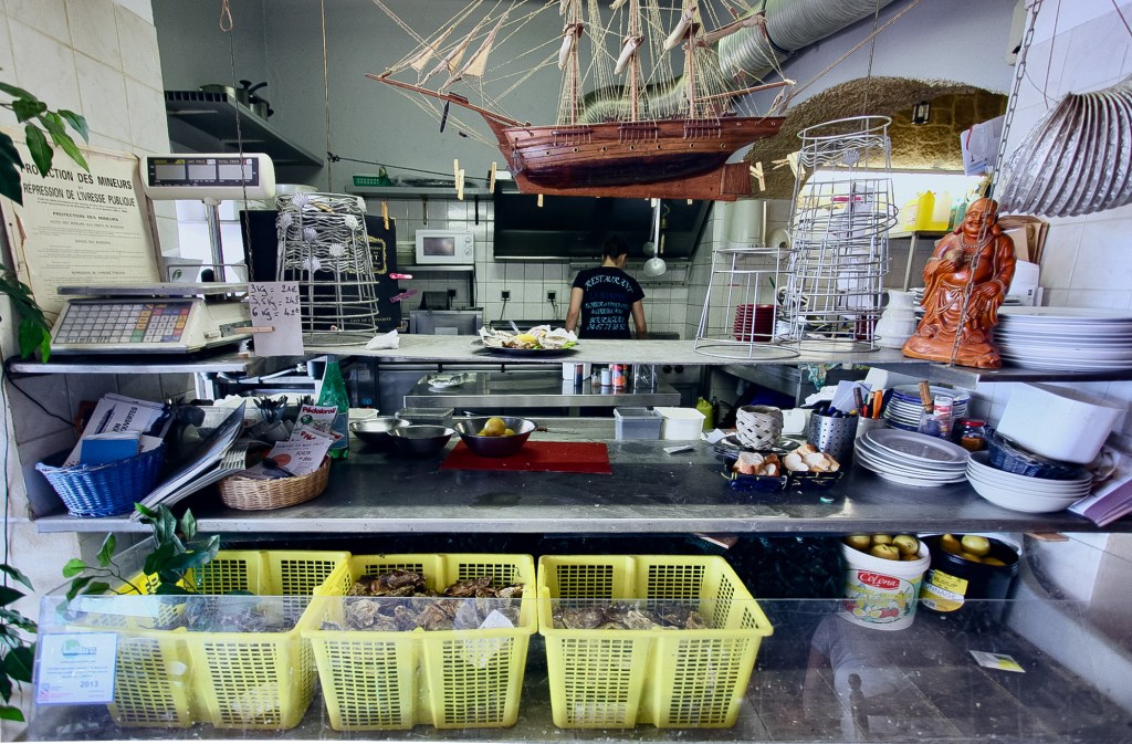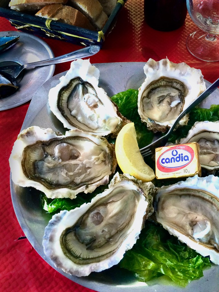 Considerably smaller than the other two cities we visited, Bouzigues is located on the shore of the Étang de Thau and was the original site of oyster farming in the area, which now produces some 13,000 tonnes of oysters annually according to Wikipedia. The oyster and mussel tables are visible from the shore, and these beauties are served along with local fish at the small cafes and restaurants dotting Avenue Louis Tudesq, the main road which runs along the lagoon. Staying here allowed us to enjoy some amazing meals, world-class seafood, house wine and each other’s company. Raw mussels, typically presented in a fashion similar to oysters with a dash of red wine vinegar? Yes, please.